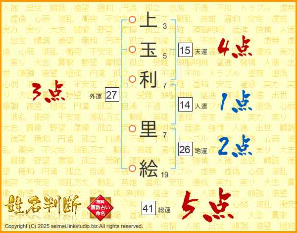 上(3画)玉(5画)利(7画) 里(7画)絵(19画)