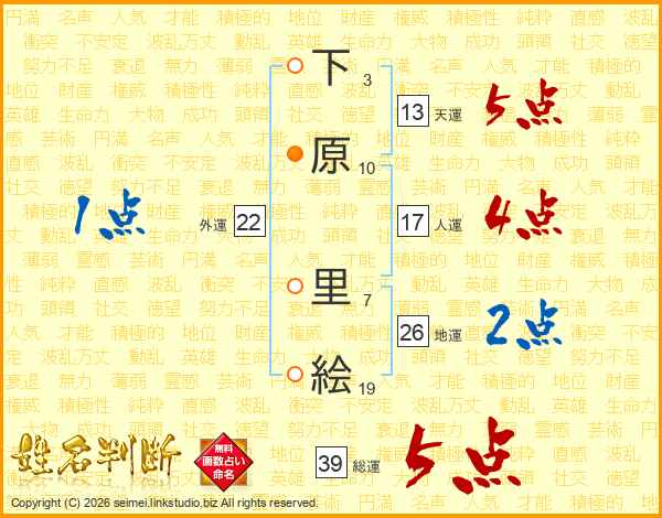 生活面を象徴する運勢です。外部から受ける影響力を表し、結婚運、家庭運や職場、環境への順応性を表します。総運から人運を引いた画数。姓や名が1文字の場合を除く。