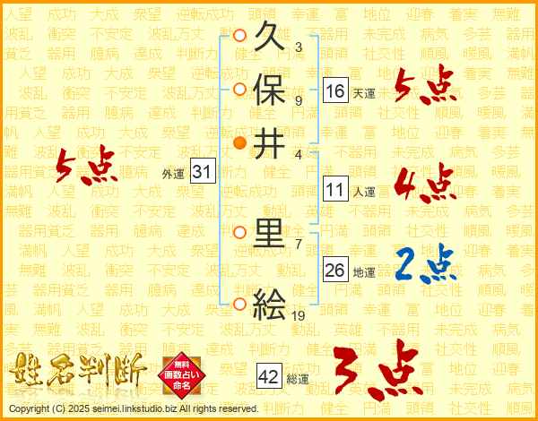 久(3画)保(9画)井(4画) 里(7画)絵(19画)