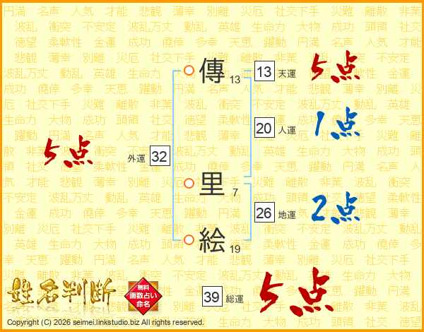 傳里絵さんの総運は39画の5点!