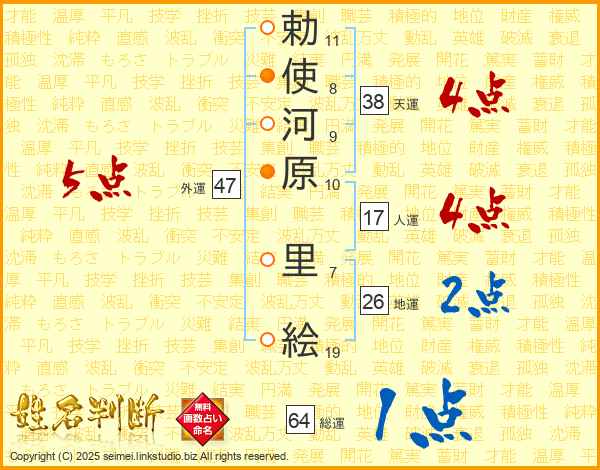 勅(11画)使(8画)河(9画)原(10画) 里(7画)絵(19画)