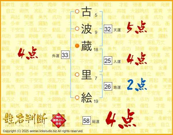 古(5画)波(9画)蔵(18画) 里(7画)絵(19画)