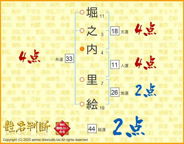 堀(11画)之(3画)内(4画) 里(7画)絵(19画)