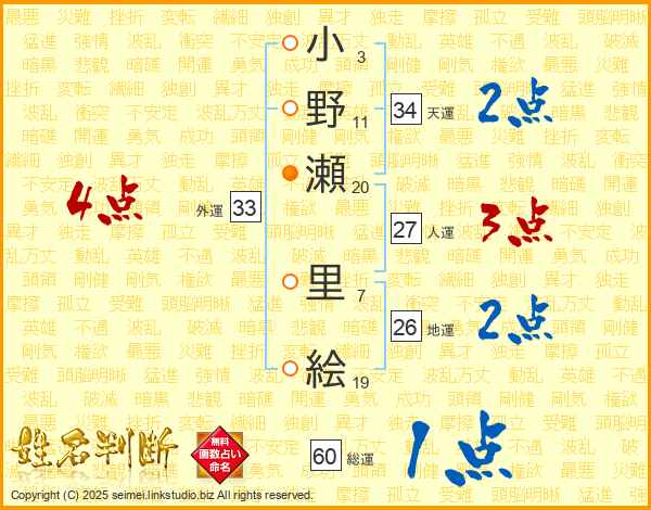 小(3画)野(11画)瀬(20画) 里(7画)絵(19画)