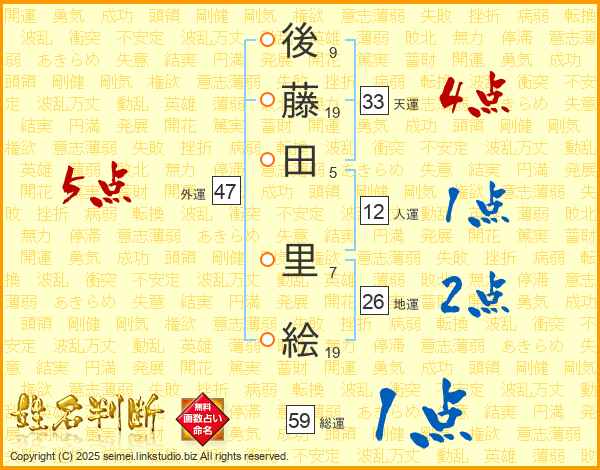 後(9画)藤(19画)田(5画) 里(7画)絵(19画)