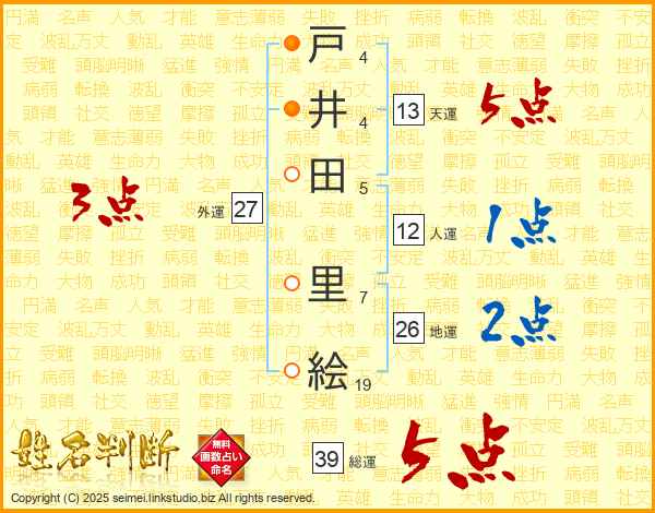 戸(4画)井(4画)田(5画) 里(7画)絵(19画)
