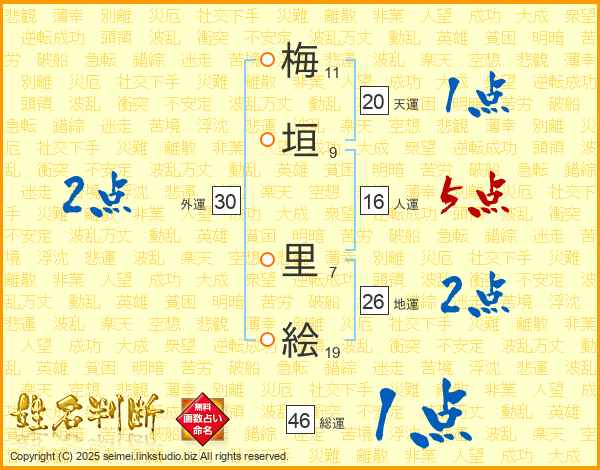 梅(11画)垣(9画) 里(7画)絵(19画)