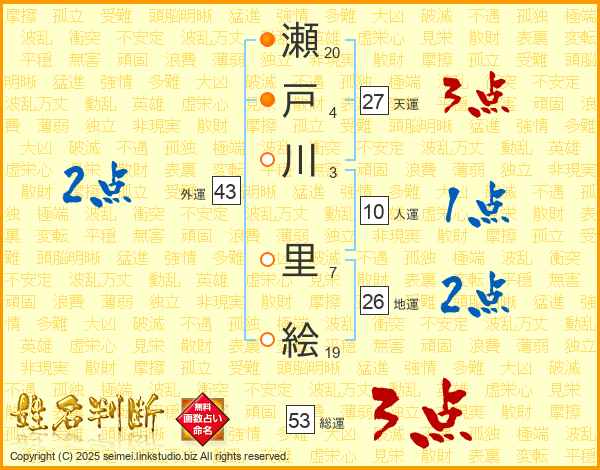 瀬(20画)戸(4画)川(3画) 里(7画)絵(19画)