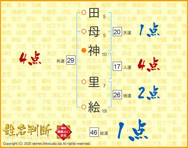 田母神里絵さんの総運は46画の1点!