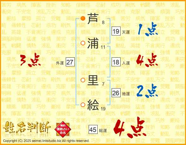 芦(8画)浦(11画) 里(7画)絵(19画)