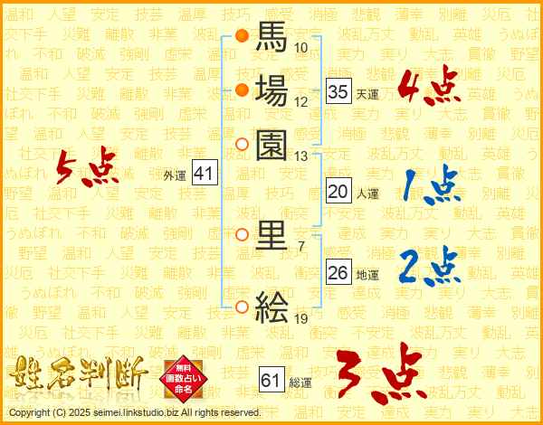 馬(10画)場(12画)園(13画) 里(7画)絵(19画)