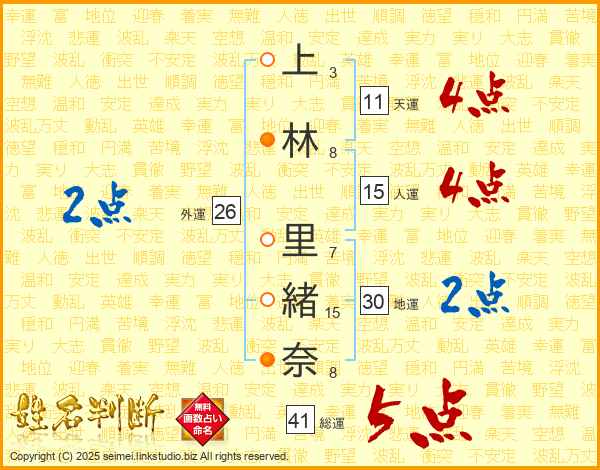上(3画)林(8画) 里(7画)緒(15画)奈(8画)