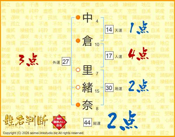 中(4画)倉(10画) 里(7画)緒(15画)奈(8画)