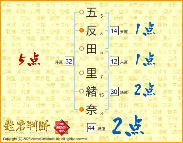 五(5画)反(4画)田(5画) 里(7画)緒(15画)奈(8画)