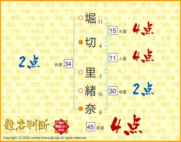 堀(11画)切(4画) 里(7画)緒(15画)奈(8画)