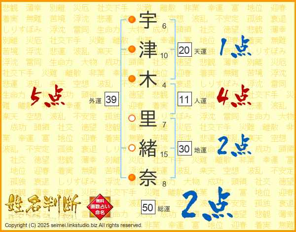 宇(6画)津(10画)木(4画) 里(7画)緒(15画)奈(8画)