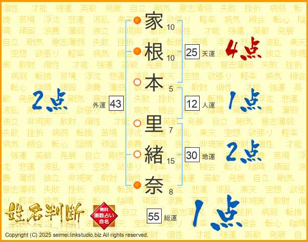 家(10画)根(10画)本(5画) 里(7画)緒(15画)奈(8画)