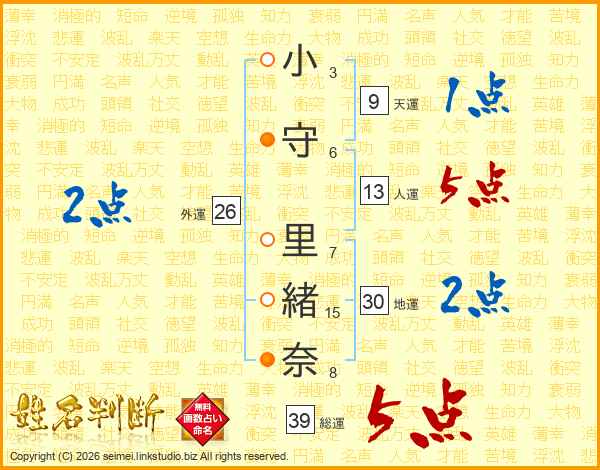 小(3画)守(6画) 里(7画)緒(15画)奈(8画)