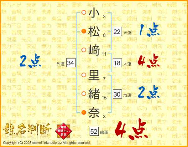 小(3画)松(8画)﨑(11画) 里(7画)緒(15画)奈(8画)