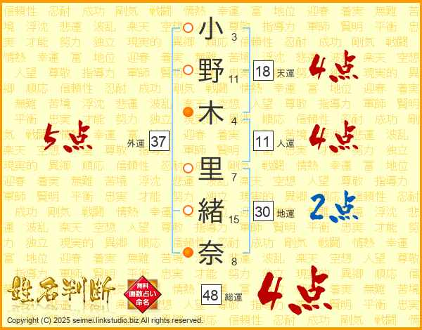 小(3画)野(11画)木(4画) 里(7画)緒(15画)奈(8画)