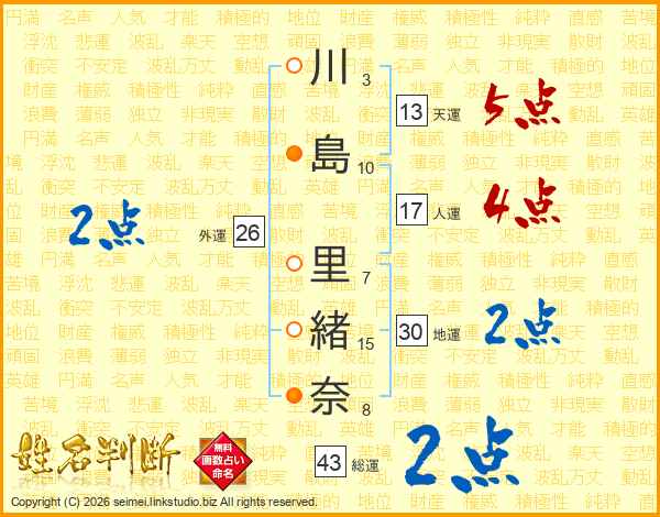 川(3画)島(10画) 里(7画)緒(15画)奈(8画)