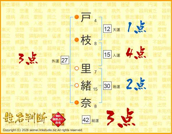 戸(4画)枝(8画) 里(7画)緒(15画)奈(8画)
