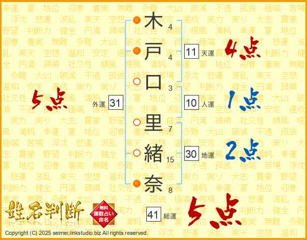 木(4画)戸(4画)口(3画) 里(7画)緒(15画)奈(8画)