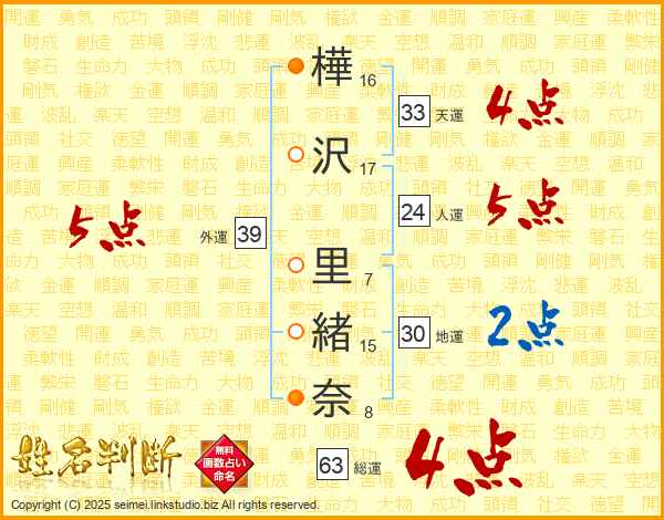 樺(16画)沢(17画) 里(7画)緒(15画)奈(8画)