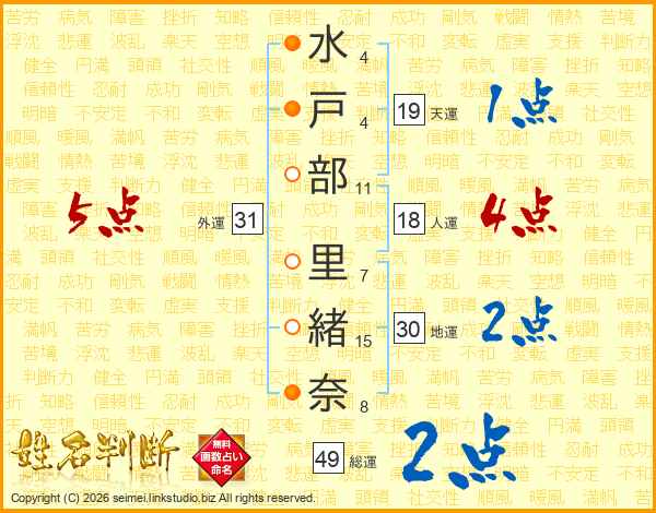 水(4画)戸(4画)部(11画) 里(7画)緒(15画)奈(8画)