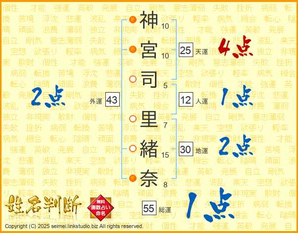 神(10画)宮(10画)司(5画) 里(7画)緒(15画)奈(8画)