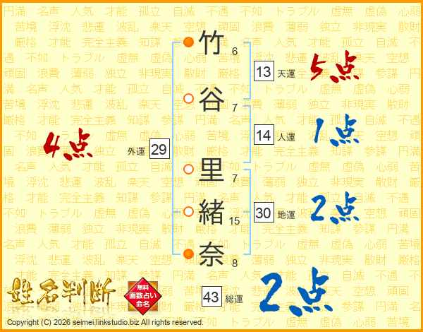 竹(6画)谷(7画) 里(7画)緒(15画)奈(8画)