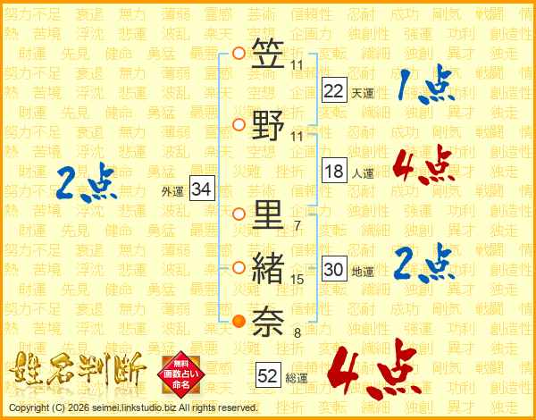 笠(11画)野(11画) 里(7画)緒(15画)奈(8画)