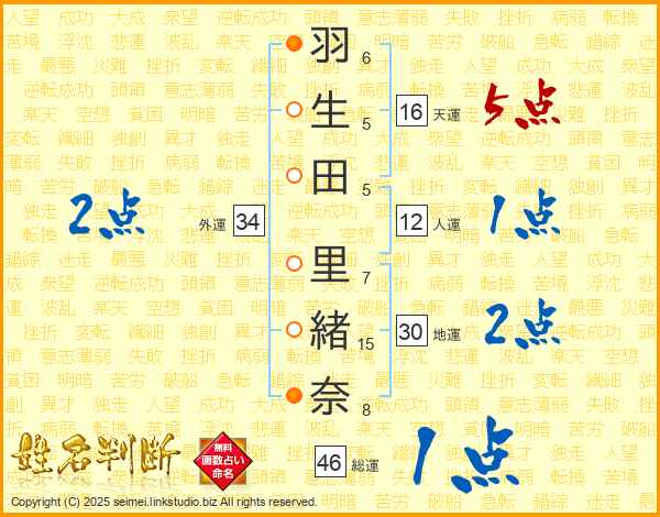 羽(6画)生(5画)田(5画) 里(7画)緒(15画)奈(8画)