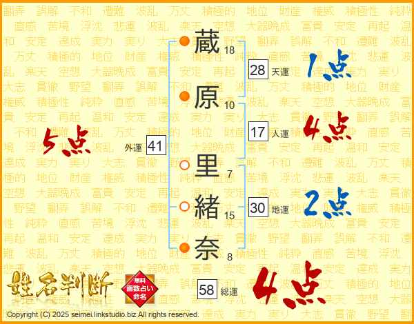 蔵(18画)原(10画) 里(7画)緒(15画)奈(8画)