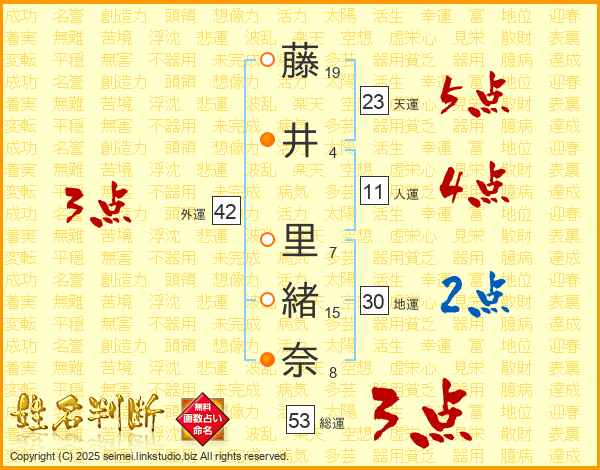 藤(19画)井(4画) 里(7画)緒(15画)奈(8画)