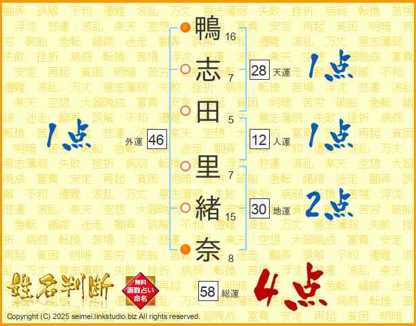 鴨(16画)志(7画)田(5画) 里(7画)緒(15画)奈(8画)