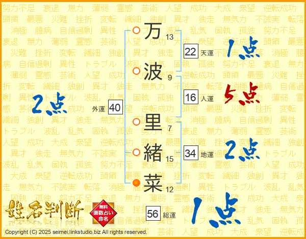 万(13画)波(9画) 里(7画)緒(15画)菜(12画)
