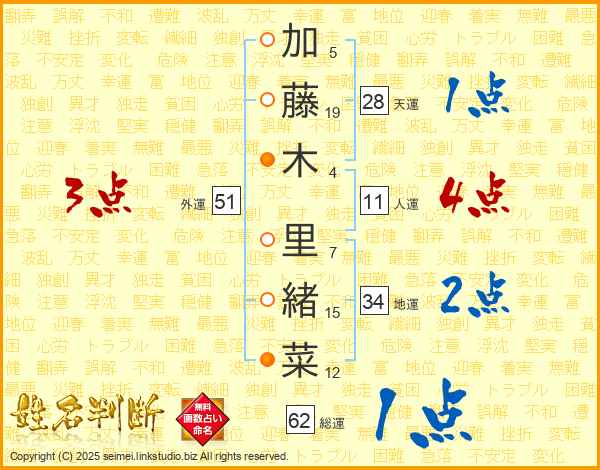 加(5画)藤(19画)木(4画) 里(7画)緒(15画)菜(12画)