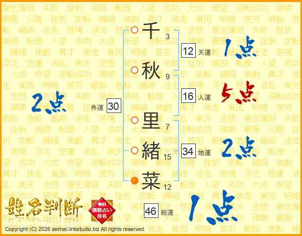 千(3画)秋(9画) 里(7画)緒(15画)菜(12画)