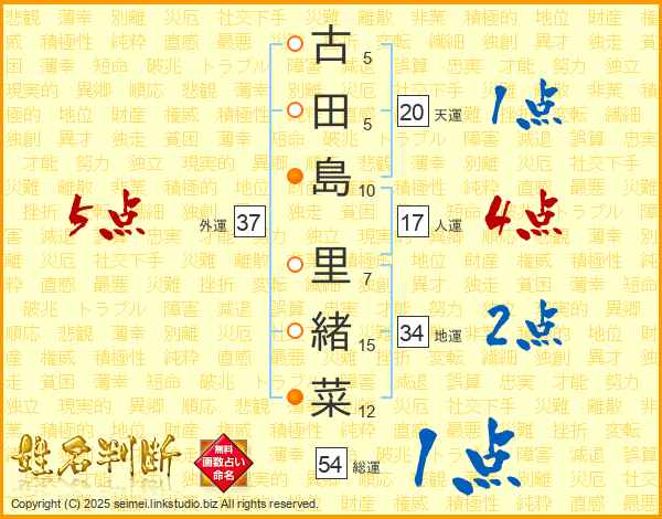 古(5画)田(5画)島(10画) 里(7画)緒(15画)菜(12画)