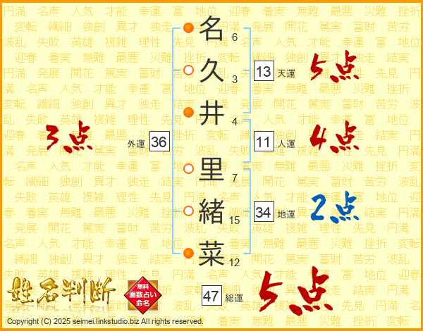 名(6画)久(3画)井(4画) 里(7画)緒(15画)菜(12画)