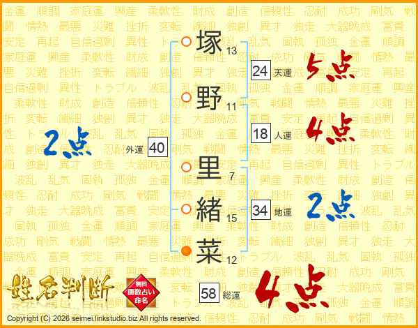 塚野里緒菜さんの総運は58画の4点!