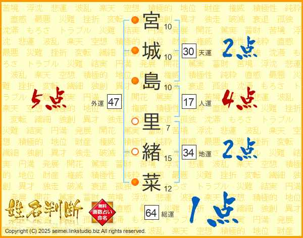 宮城島里緒菜さんの地運は34画の2点!