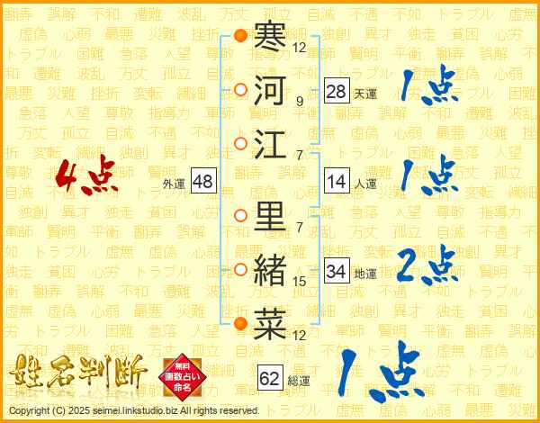 寒河江里緒菜さんの人運は14画の1点!