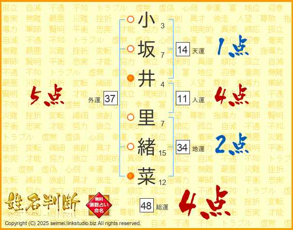 小(3画)坂(7画)井(4画) 里(7画)緒(15画)菜(12画)