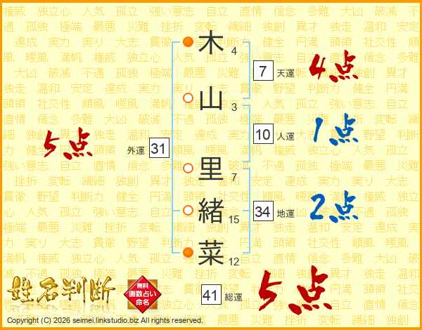 木(4画)山(3画) 里(7画)緒(15画)菜(12画)