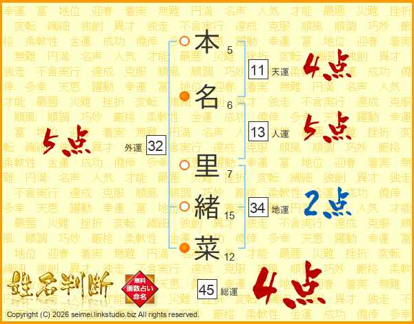 本(5画)名(6画) 里(7画)緒(15画)菜(12画)