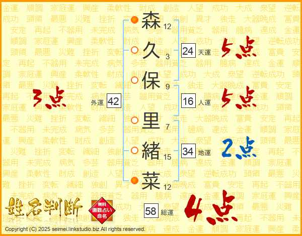 森(12画)久(3画)保(9画)  里(7画)緒(15画)菜(12画)