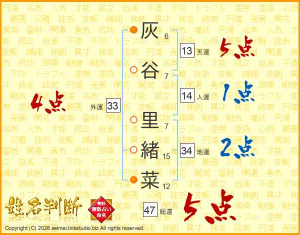 灰(6画)谷(7画) 里(7画)緒(15画)菜(12画)