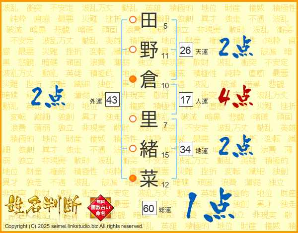 生活面を象徴する運勢です。外部から受ける影響力を表し、結婚運、家庭運や職場、環境への順応性を表します。総運から人運を引いた画数。姓や名が1文字の場合を除く。